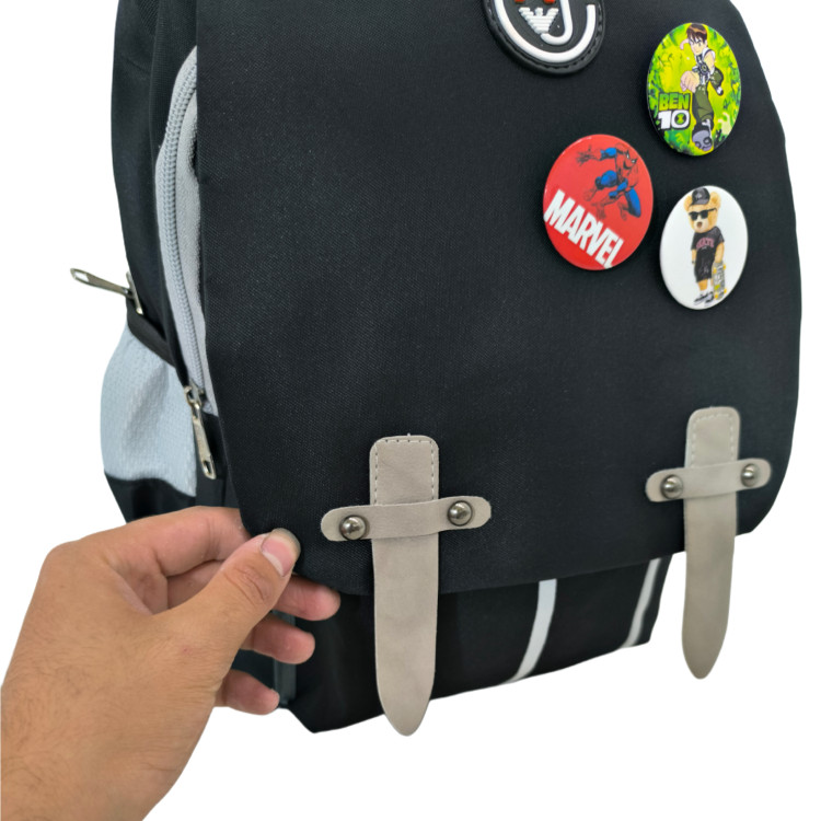 این کوله پشتی ساده اما شیک در دو رنگ صورتی و مشکی و سرمه ای در فروشگاه کوله چی موجود است. دارای سه پیکسل طرح دار فانتزی بوده و کاملا سبک میباشد. مناسب گل دختر ها و گل پسرهای دبستانی میباشد. دارای سه زیپ از جنس فلزی و پلاستیکی با فضای مجزا است. قابلیت شستشو دارد. دو فضا در کنارههای کوله جهت قراردادن قمقمه و بطری آب وجود دارد. تمام آستر بوده و زیپ های روانی دارد.